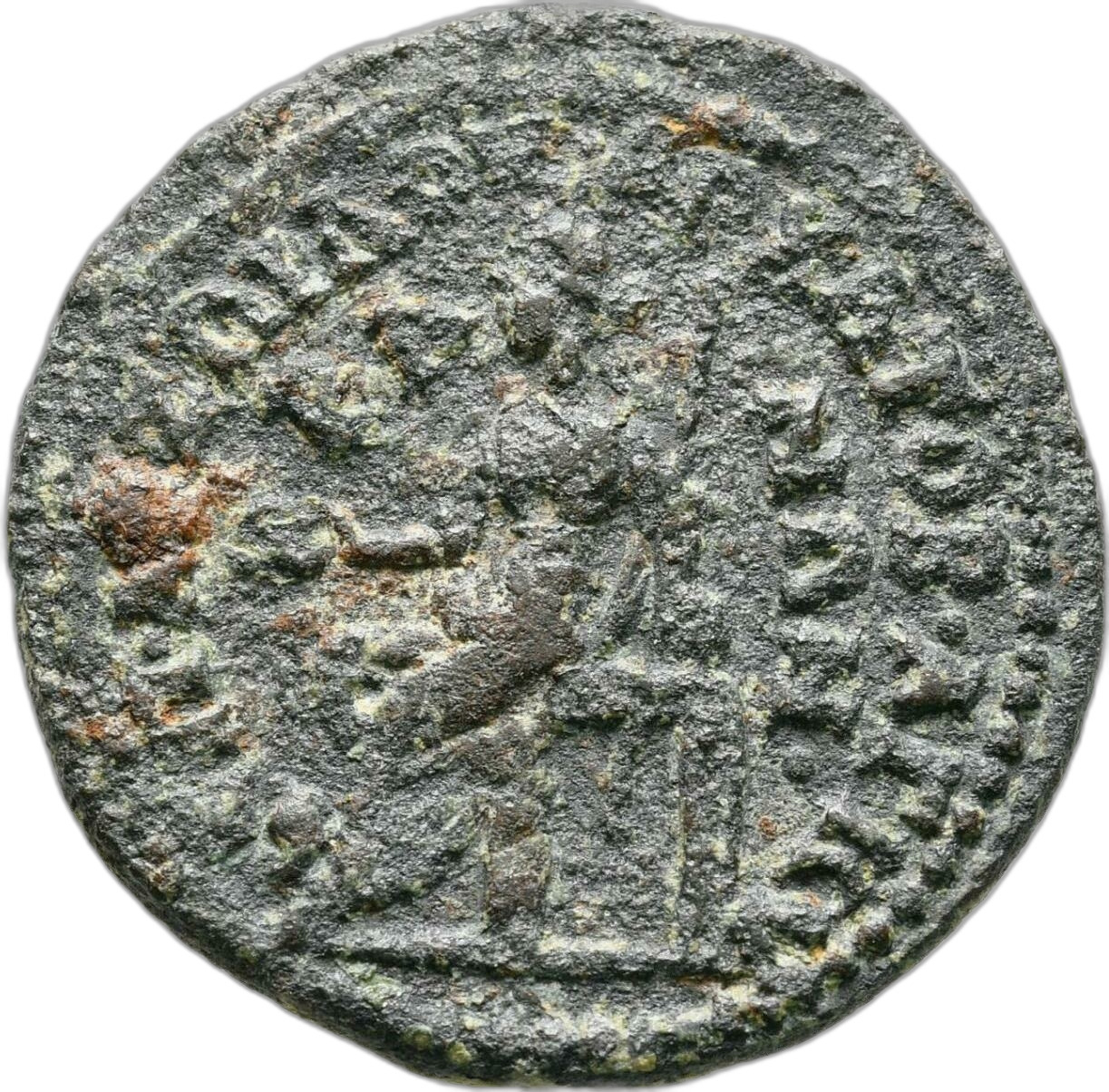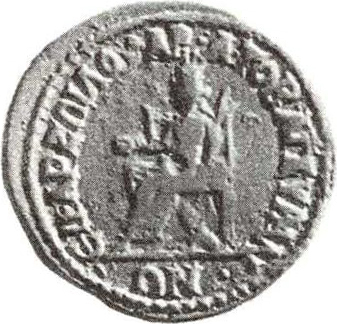 Cybele seated left, holding patera and sceptre, resting arm on tympanum; at feet (or beneath seat), lion |