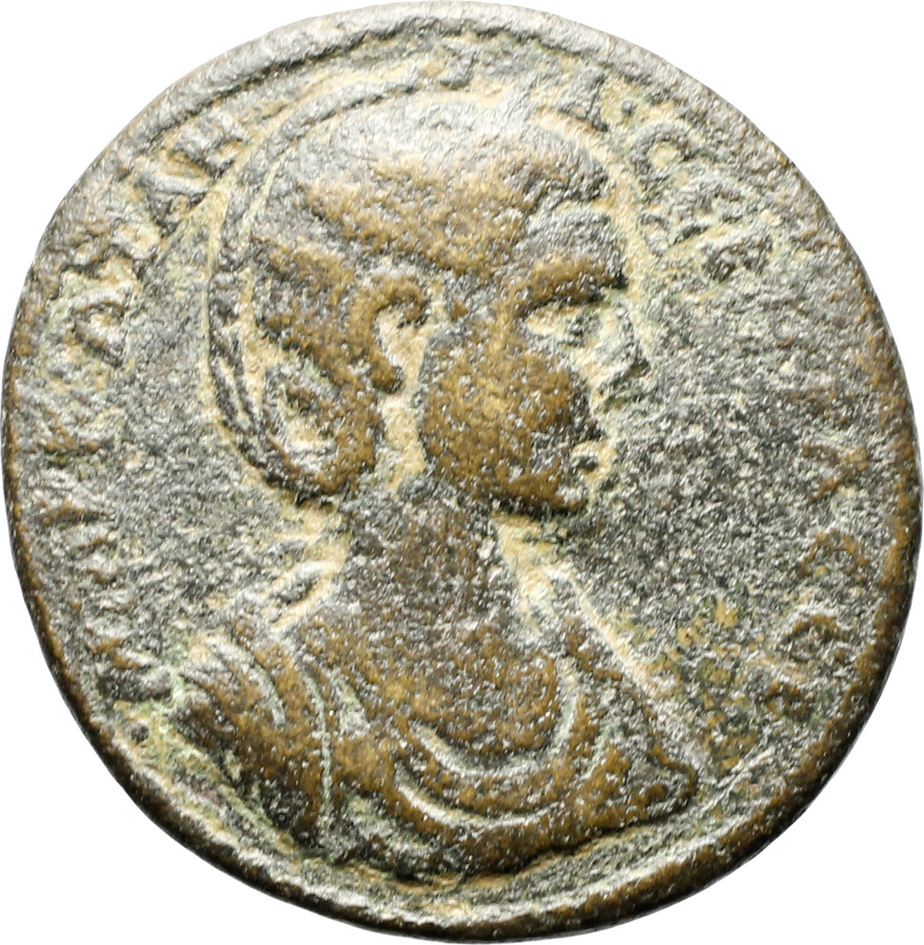 Apollo standing facing, head left, holding branch and leaning on tripod entwined by serpent; left, tree and lyre; right, bow |