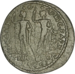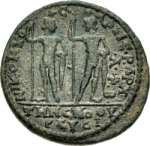 Dioscuri standing facing., each wearing pileus, holding spear, star above head |