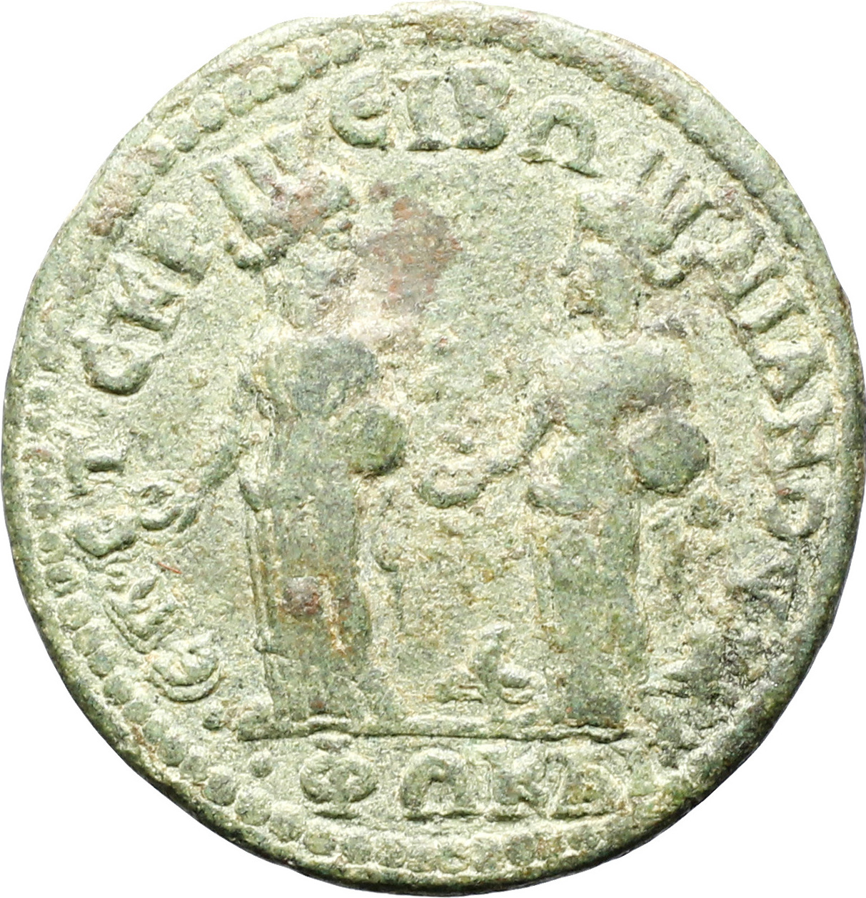 Tyche and Cybele standing facing each other, both holding patera and tympanum; at feet of Cybele, two lions |