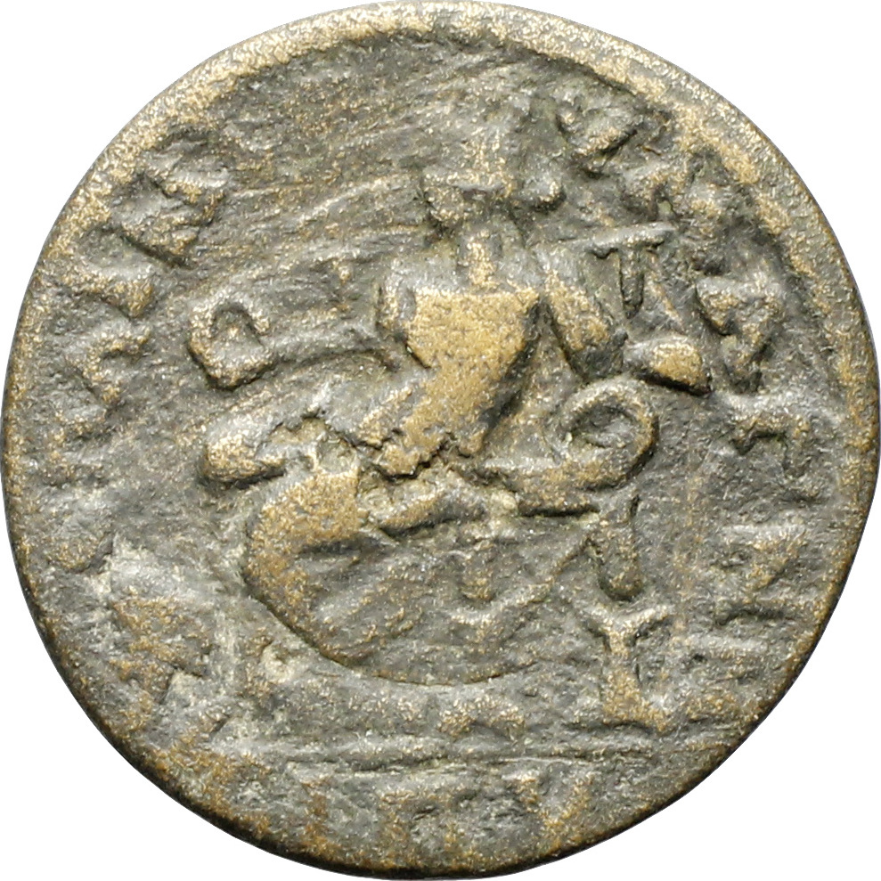 GIC 198 (turreted bust of Tyche, r. (no letters before and after)) ; countermark flat struck, so that the underlying omega is still visible