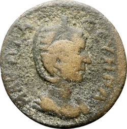 Tyche standing left, holding figure of Ares and cornucopia; at feet, lighted altar |