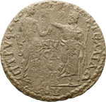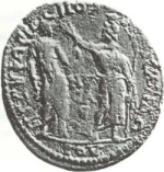 Isis standing right, facing Sarapis standing left, holding sceptre and raising hand |