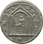 temple with four columns and rounded pediment enclosing statue of seated Zeus, left, holding Nike and sceptre