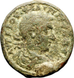 Tyche standing left, holding rudder and ears of corn, and cornucopia |