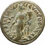 Tyche standing left, holding rudder and ears of corn, and cornucopia |