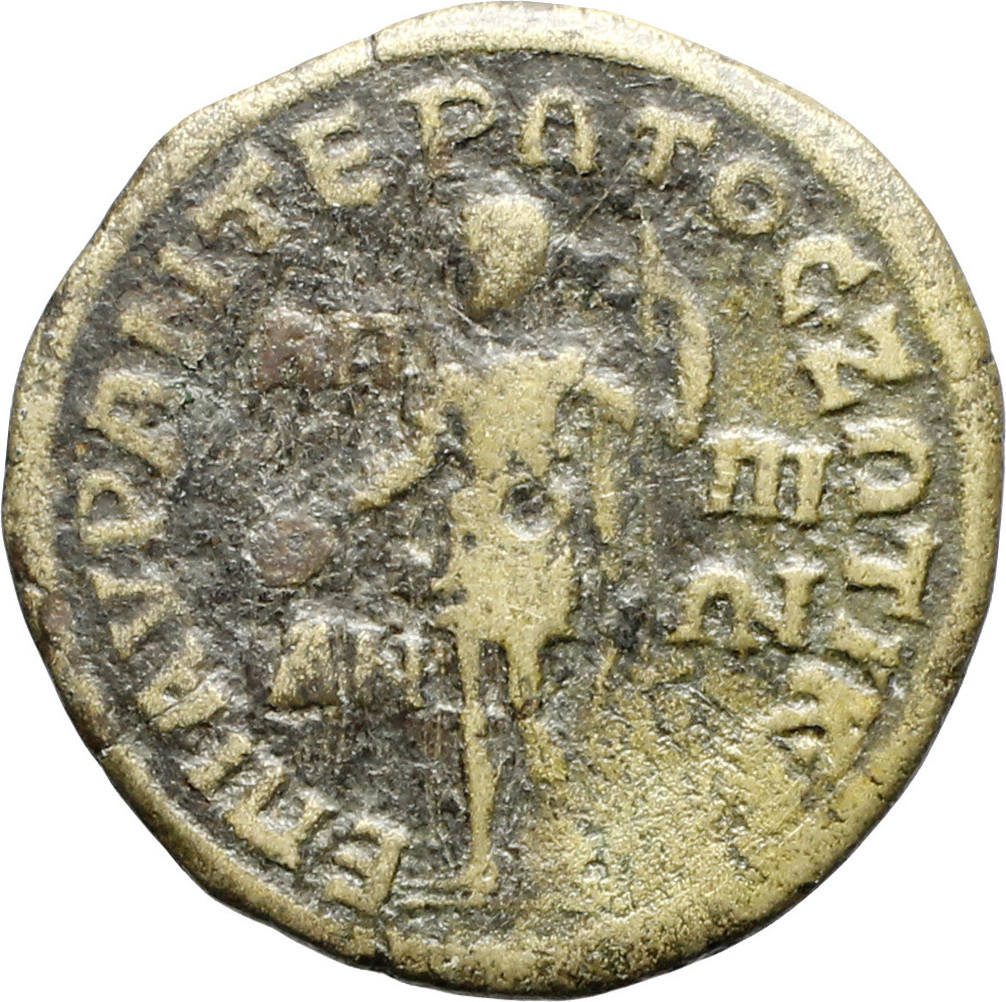 emperor standing left, holding patera and spear |