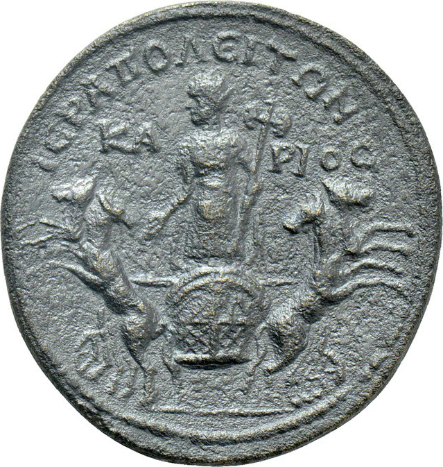 Apollo Karios standing facing in quadriga drawn by four galloping horses, holding patera and double axe