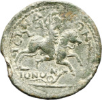 horseman galloping right, brandishing spear pointed downwards; beneath, serpent; in front, palm