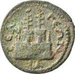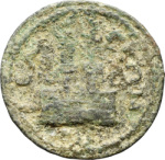 monumental podium with two sacred trees surmounted by bird, each in enclosure (?) decorated with garland; in front, two small altars; to left and right, thunderbolt and club; beneath, wreath