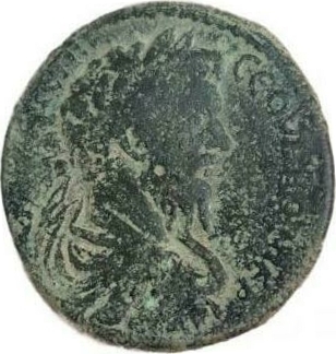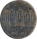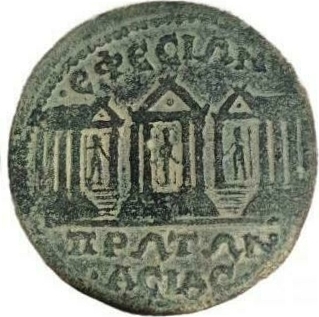 temple with four columns enclosing cult statue of Artemis of Ephesus standing facing, wearing kalathos, with supports, between two temples with two colums, seen in perspective, enclosing cult statue of an emperor standing, holding sceptre |