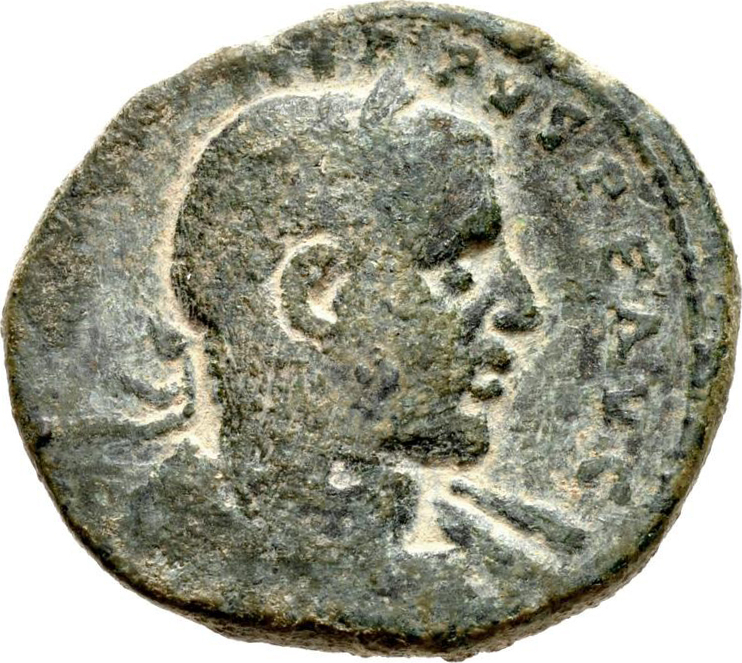 emperor, in military dress, standing right, holding sceptre facing Fortuna standing left, right foot on prow, holding small bust and sceptre, and Bacchus standing facing, head left; between the emperor and Fortuna, small figure standing left, sacrificing over altar; between Fortuna and Bacchus, half-length figure of harbour god right; behind the emperor, aplustre and prow of ship |