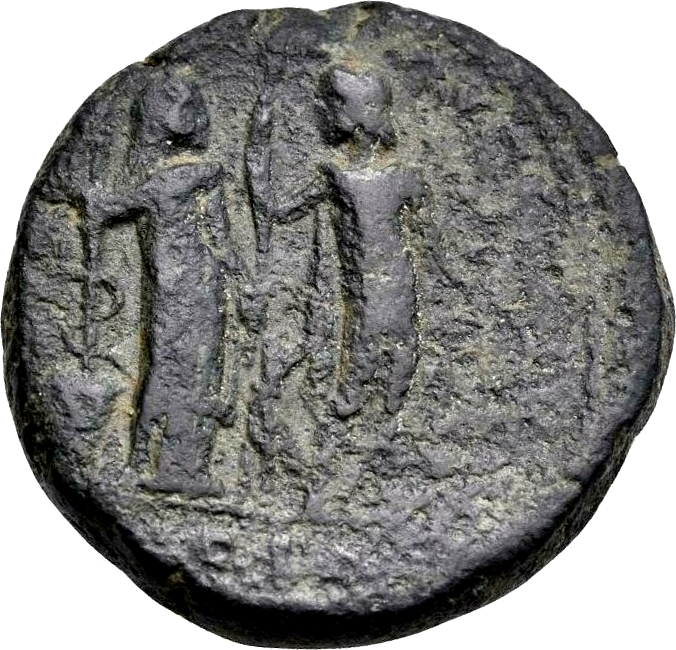 Ceres standing right, holding ears of corn and resting on torch around which a serpent coils, emerging from a cista, facing Bacchus standing left, holding bunch of grapes (?) and thyrsus |