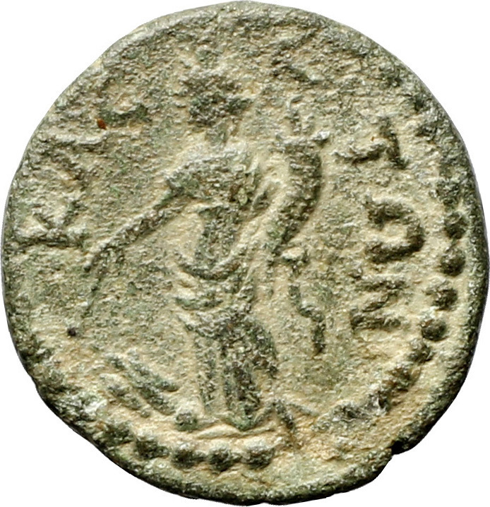 Tyche standing left, holding rudder and cornucopia