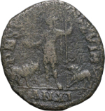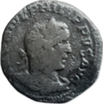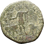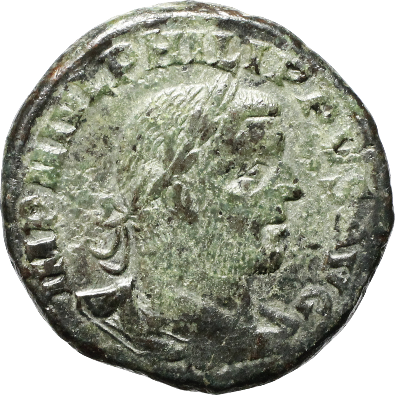 Philip I (?) standing left, holding Victory and sceptre; at left, bull standing right; at right, lion standing left |