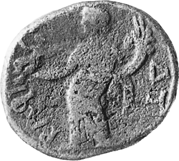 Tyche standing left, holding infant Dionysus with grapes and cornucopia