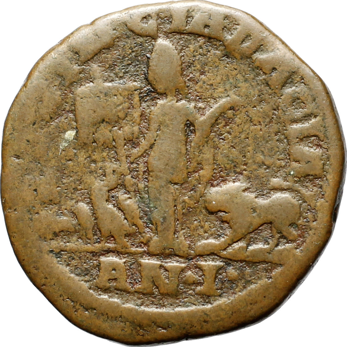 Dacia, wearing Dacian cap, standing left, holding vexillum inscribed D F and sword; at left, eagle standing left, head right, holding wreath in beak; at right, lion standing left