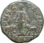 Moesia standing left; at left, bull standing right; at right, lion standing left
