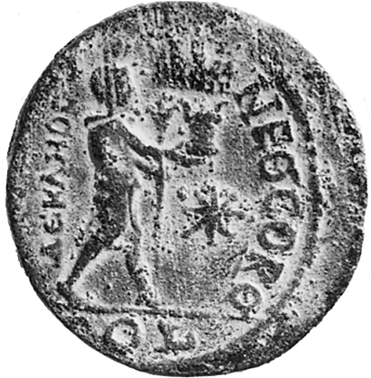 Dekanos advancing right, holding altar and long torch; at right, star; above, Mount Gerizim |