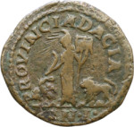 Dacia, wearing Dacian cap, standing left, holding sword and vexillum inscribed D F; at left, eagle standing left, head right, holding wreath in beak; at right, lion standing left
