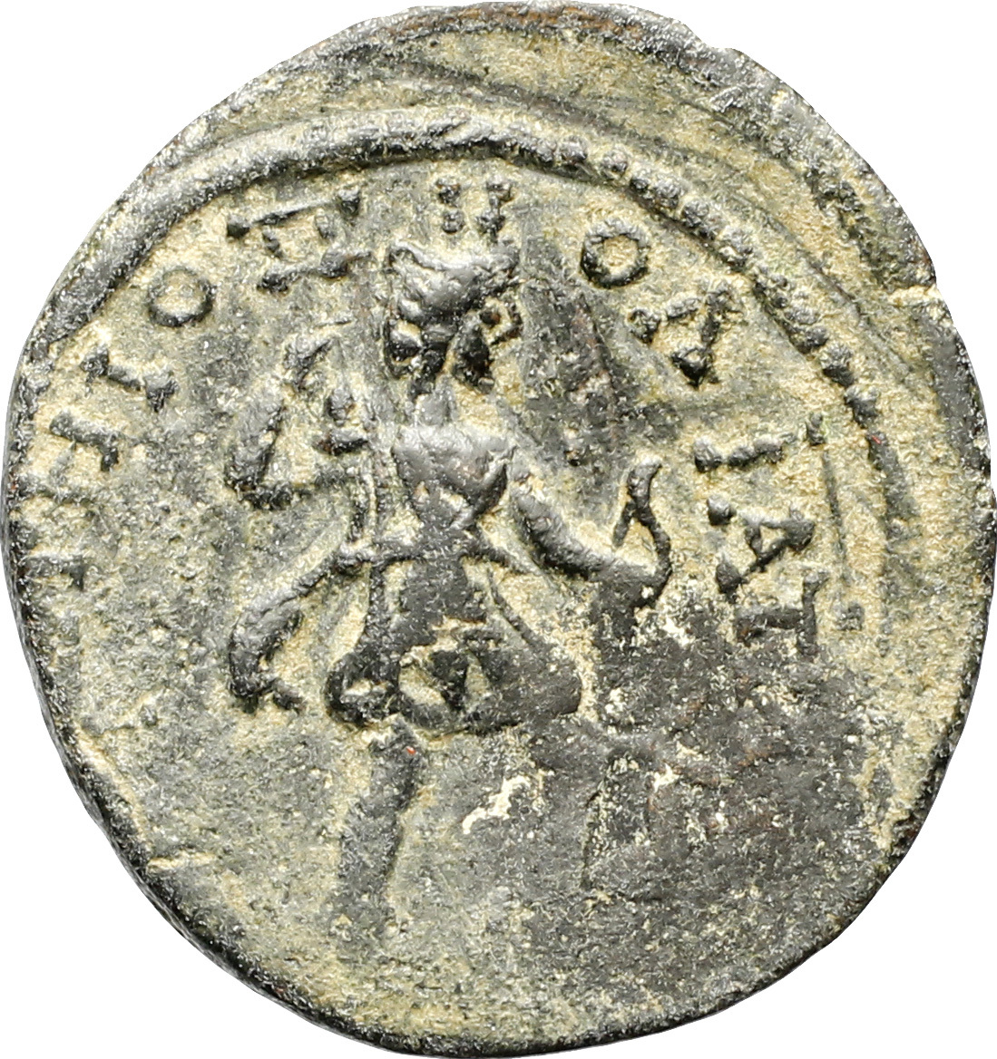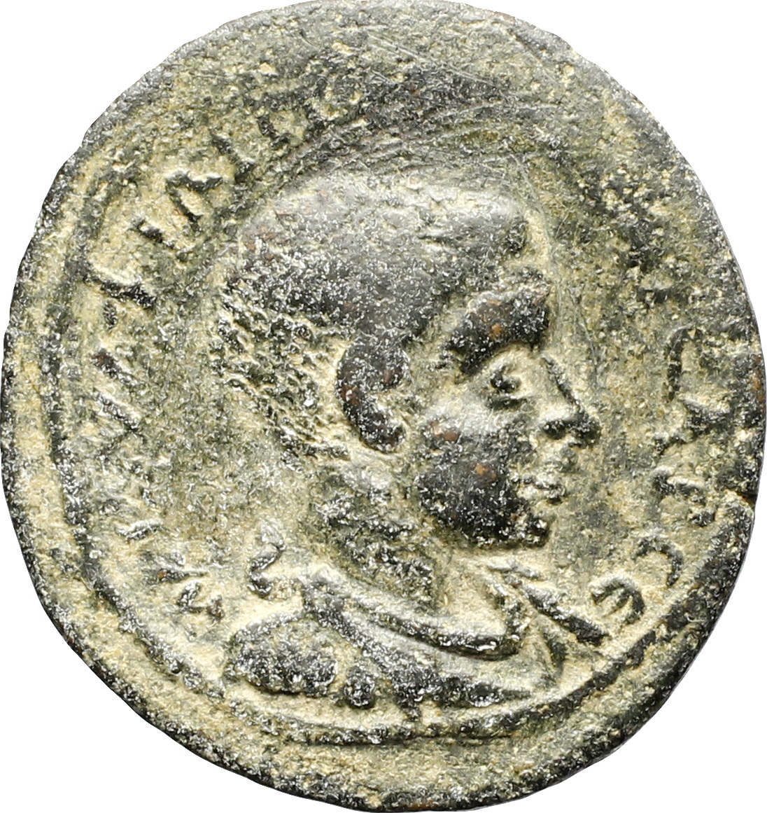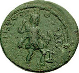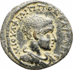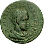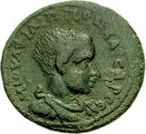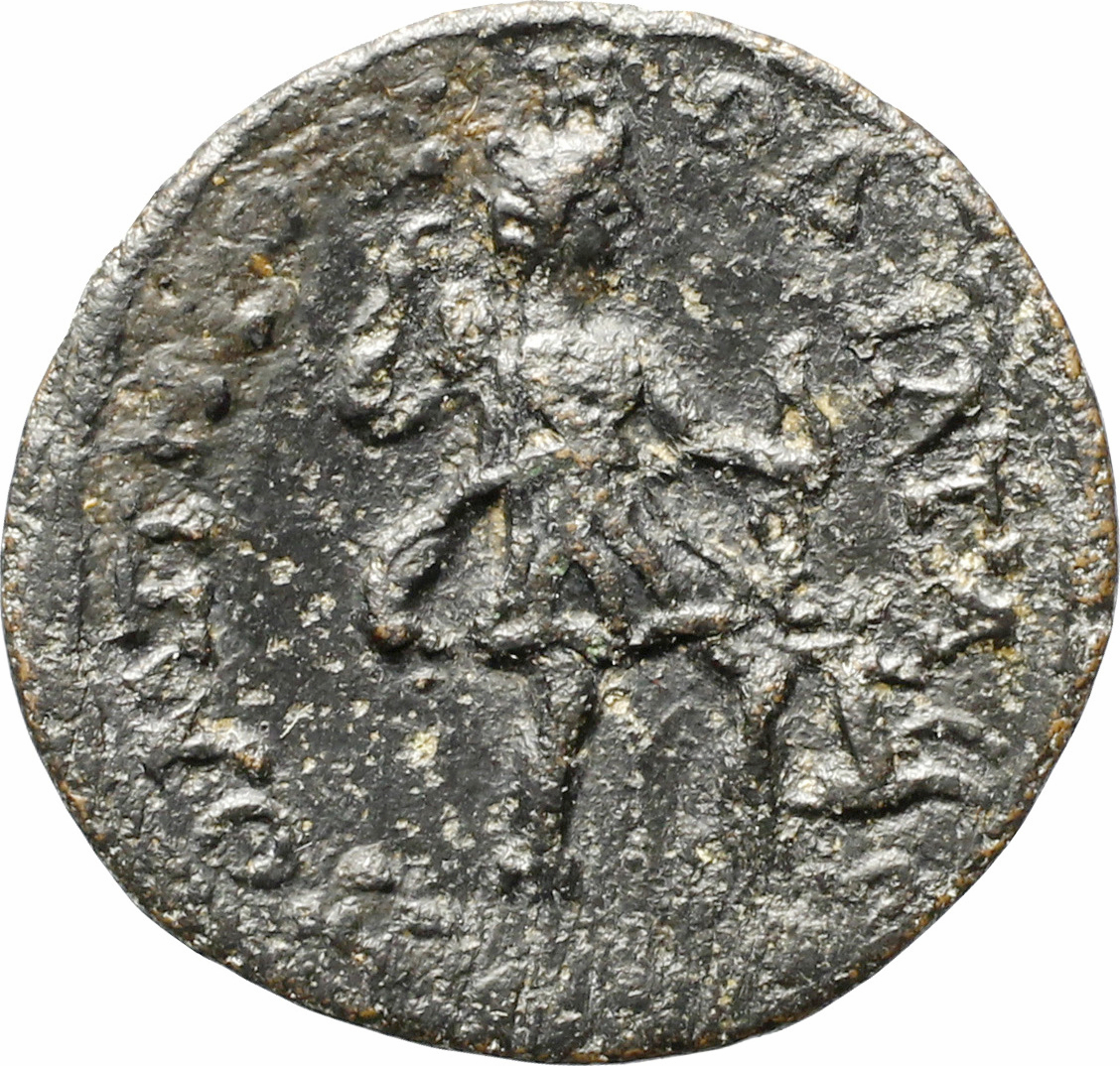 SNG vA 5896 reads ΑϚ on the rev., but this is unclear on all specimens. If this is a value mark expressed in assaria, as on the larger coins of Philip I (see introduction), then ΑƐ (for 5 assaria) seems more likely for this smaller denomination.