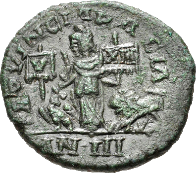 Dacia, wearing Dacian cap, standing left, holding sword and two vexilla inscribed V and XIII; at left, eagle standing left, head right, holding wreath in beak; at right, lion standing left