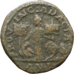 Dacia, wearing Dacian cap, standing left, holding sword and two vexilla inscribed V and XIII; at left, eagle standing left, head right, holding wreath in beak; at right, lion standing left