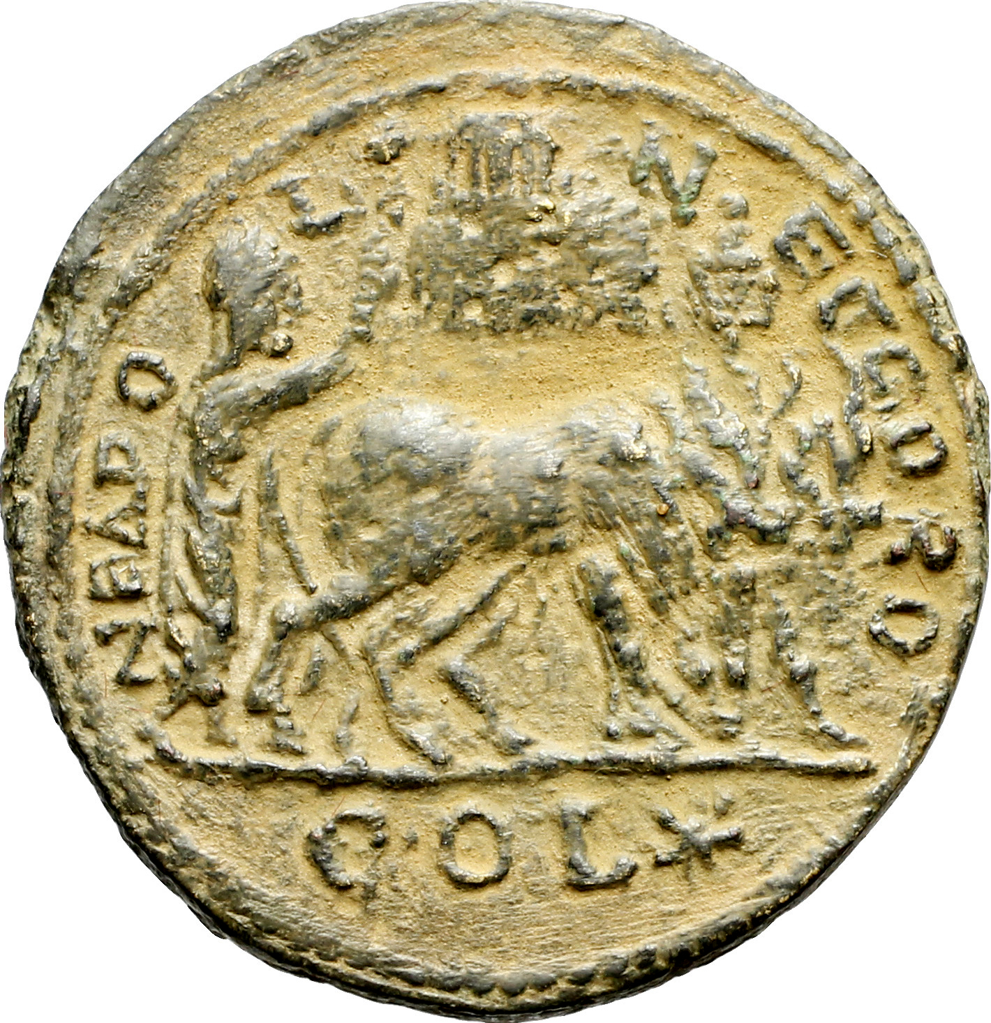 founder of the colony, ploughing with bull and cow, right; above, Mount Gerizim and vexillum with eagle; below, star