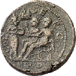 Philip I, laureate, and Philip II, radiate, seated left, on curule chairs, raising right arm, facing Fortuna of Neapolis standing right, holding wreath in both hands; in upper left, Mount Gerizim
