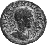 Philip I and Philip II, one togate and one in military dress, standing, facing each other, holding holding patera over altar (between them) and sceptre; above, Mount Gerizim; below, star (?)