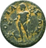 Hermes standing left, holding purse and caduceus; at his feet, ram