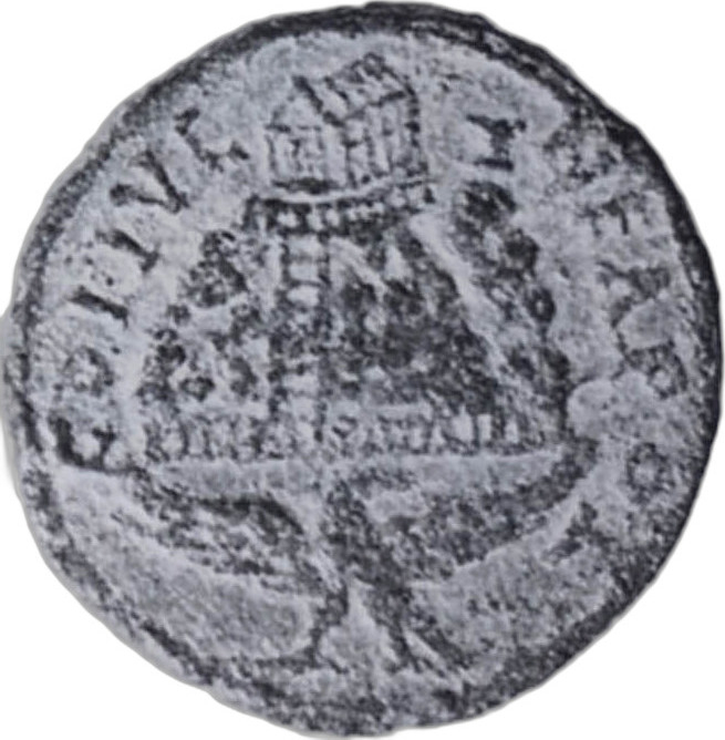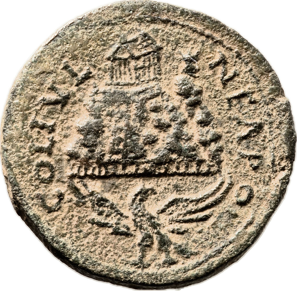 Mount Gerizim with temple in perspective, and altar (on the right), steep stairway and colonnade; below, eagle facing, head right, spreading wings