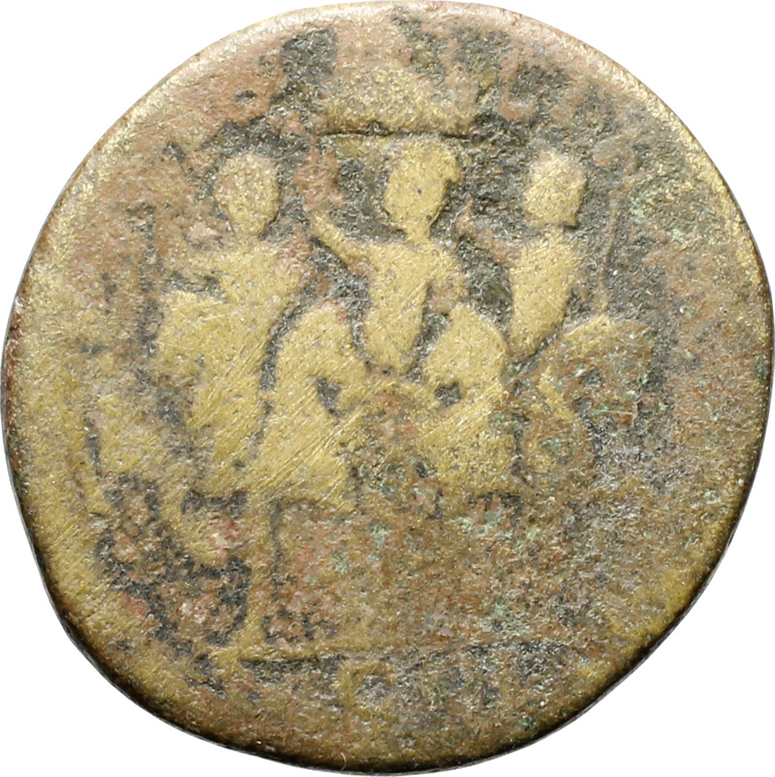 quadriga facing in which Philip I, Otacilia Severa (?) and Philip II are standing facing, head left, raising right arm, holding sceptre; above, Mount Gerizim