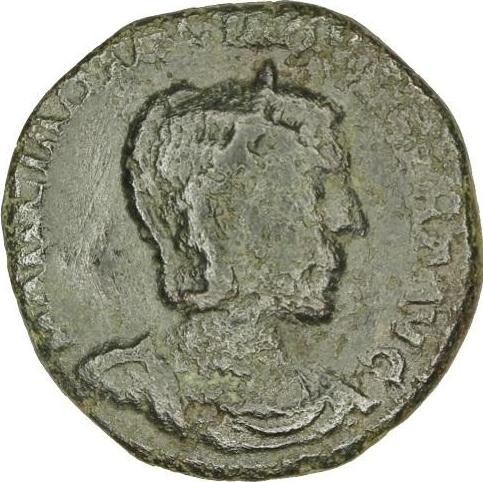 Dacia, wearing Dacian cap, standing left, holding sword and two vexilla inscribed V and XIII; at left, eagle standing left, head right, holding wreath in beak; at right, lion standing left