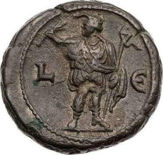 Alexandria standing left, wearing elephant headdress, holding ears of corn and vexillum