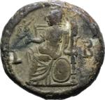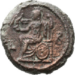 Athena seated left, holding Nike and spear; shield leaning against the throne
