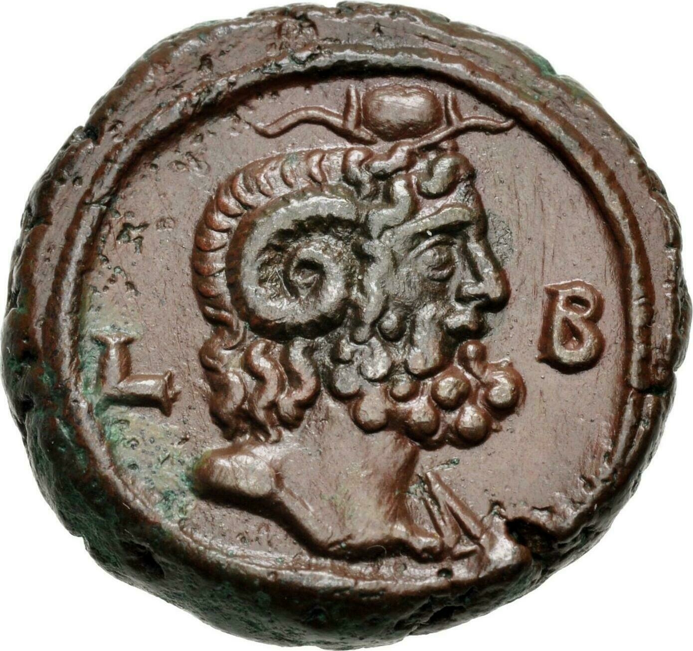 head of Ammon, right, wearing horn and headdress of ram’s horns, with drapery on left shoulder