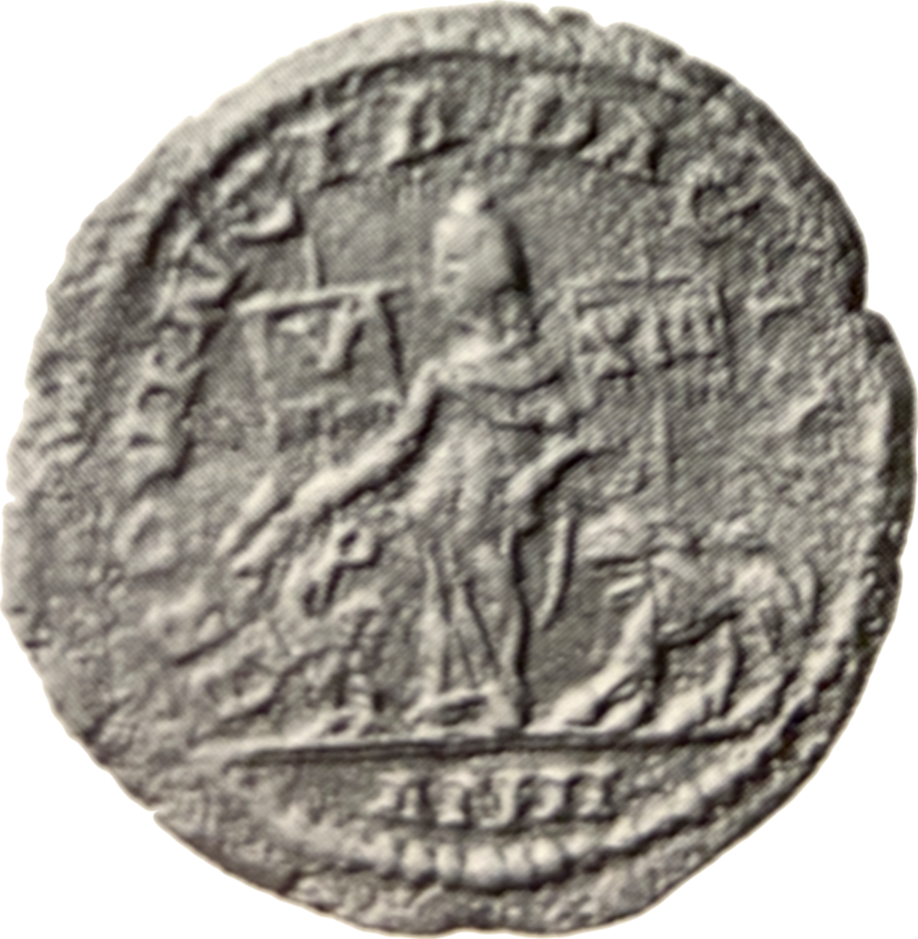Dacia, wearing Dacian cap, standing left, holding ears of corn and two vexilla inscribed V and XIII; at left, eagle standing left, head right, holding wreath in beak; at right, lion standing left