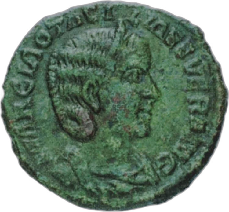 Dacia, wearing Dacian cap, seated left, holding ears of corn and two vexilla inscribed V and XIII; at left, eagle standing left, head right, holding wreath in beak; at right, lion standing left