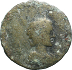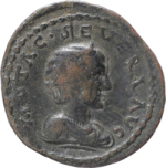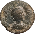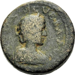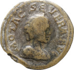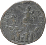 in upper register, Fortuna seated left, on rock, holding fillet or diadem and cornucopia; in upper left field, ram leaping left, head right; before, Marsyas standing right, holding wineskin and raising hand; in lower register, four Tychai: the outer pair with hands raised towards Fortuna of Damascus; left of centre figure holding up uncertain object; right of centre figure sacrificing over altar |