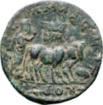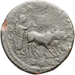 founder of the colony ploughing right; behind, inscribed vexillum; to right, ram's head right |