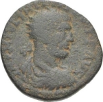 Fortuna seated left, on rock, holding fillet or diadem and cornucopia; in upper left field, ram leaping left, head right; below, upper part of river god Chrysoroas swimming; to left, Marsyas standing right, holding wineskins and with arm raised |