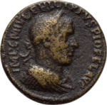 in upper register, temple with four columns containing figure standing left, hand raised, uncertain object over shoulder; below, grotto containing river god Chrysoroas reclining left, holding reed and resting on urn, water flowing beneath; to left, star; to right, crescent; bottom left, altar |