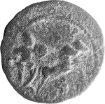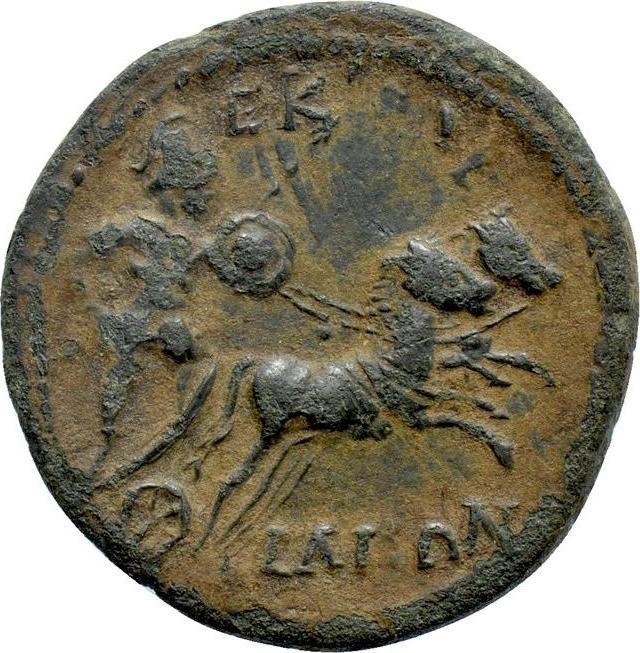 helmeted Hector standing in galloping biga right, holding shield and spear in left hand, raising right hand and about to throw stone