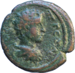 Asclepius standing right, his right hand on his heap, resting with his left on serpent staff