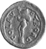 nude Marsyas standing left, on short column, raising arm, holding wineskin over shoulder