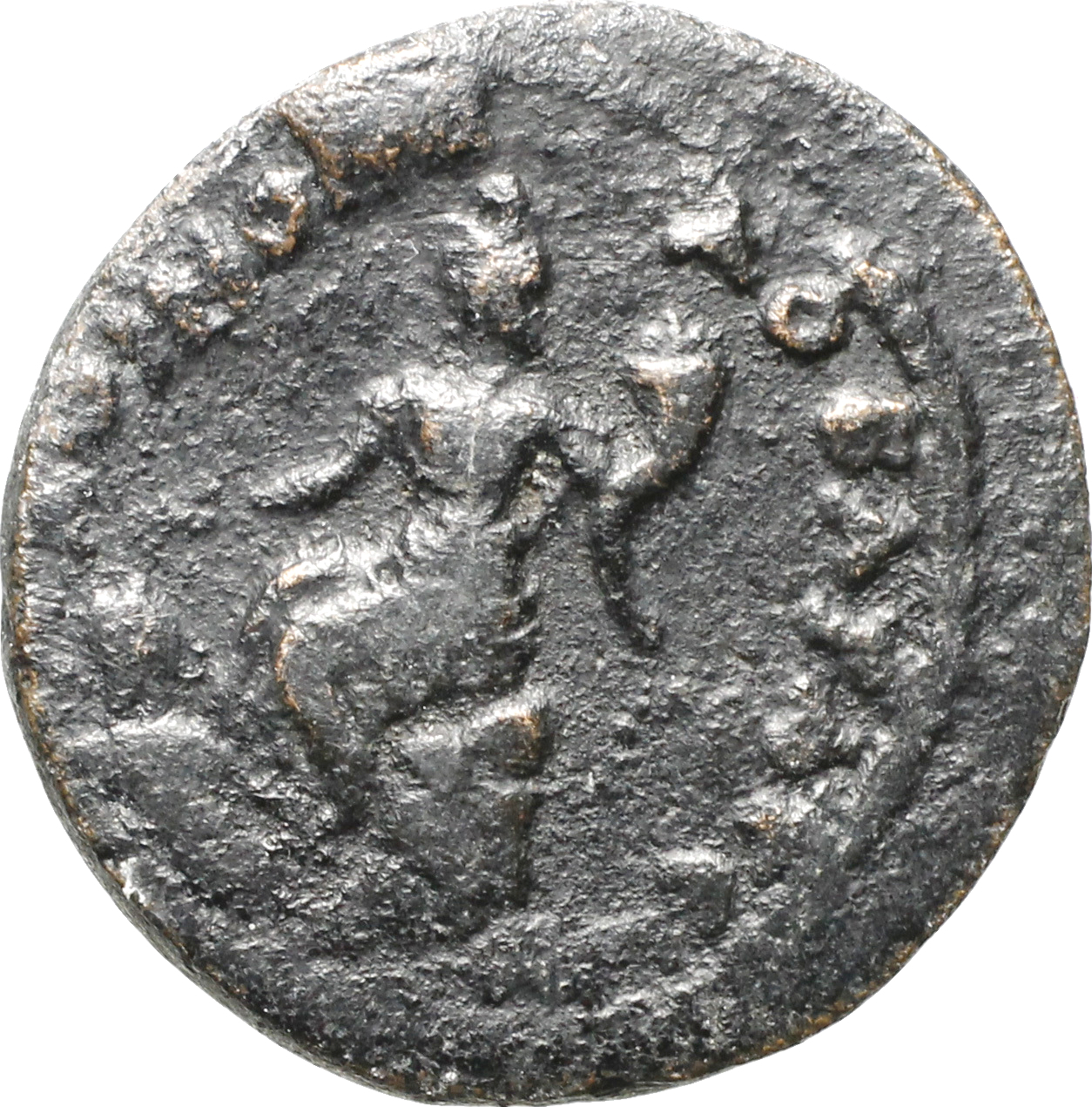 Tyche seated left, on rock, holding two ears of corn and cornucopia, resting foot on swimming river god