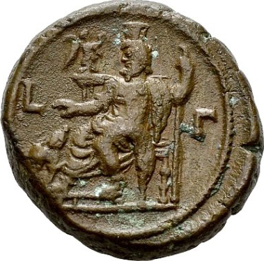 Sarapis seated left, extending arm over Cerberus, and holding sceptre; Nike on throne