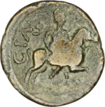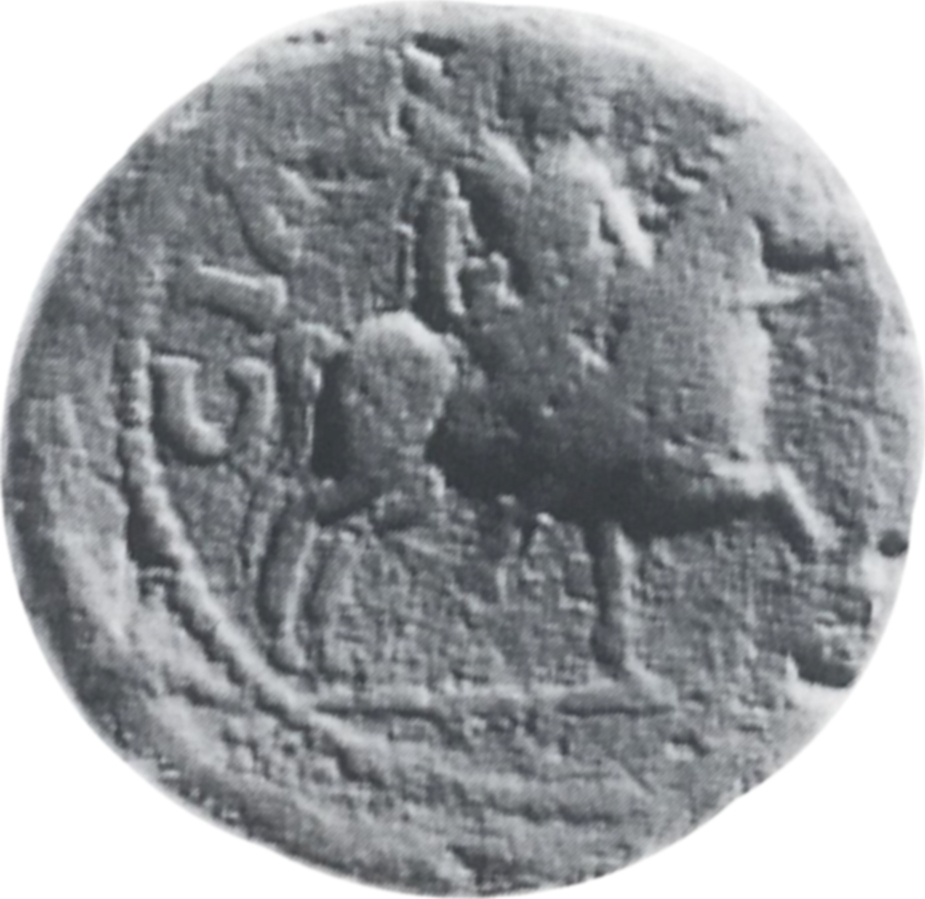 Mên on horseback riding right, crescent at shoulders