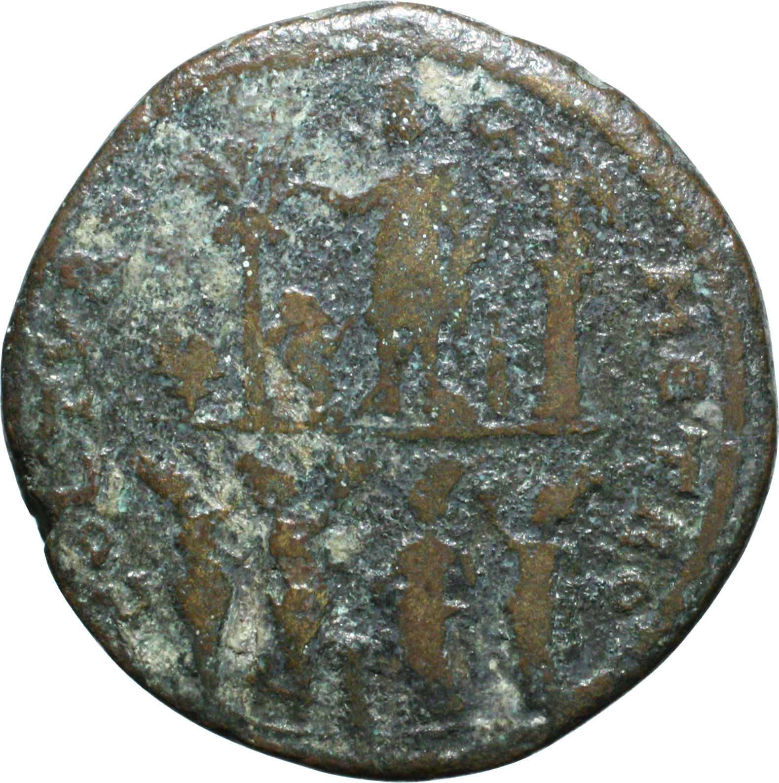 Astarte standing facing, placing right on palm tree to left and holding sceptre, crowned by Victory on column to right; on her side, Marsyas standing, club, and murex shell; below, four Tychai standing, with altar in between, sacrificing to Astarte: the first is right, looking up with upraised right hand; the second is right, looking up and holding with upraised right hand dish with offerings; the third is left, looking down and pouring libation on altar; the fourth is left, holding with upraised right wreath |